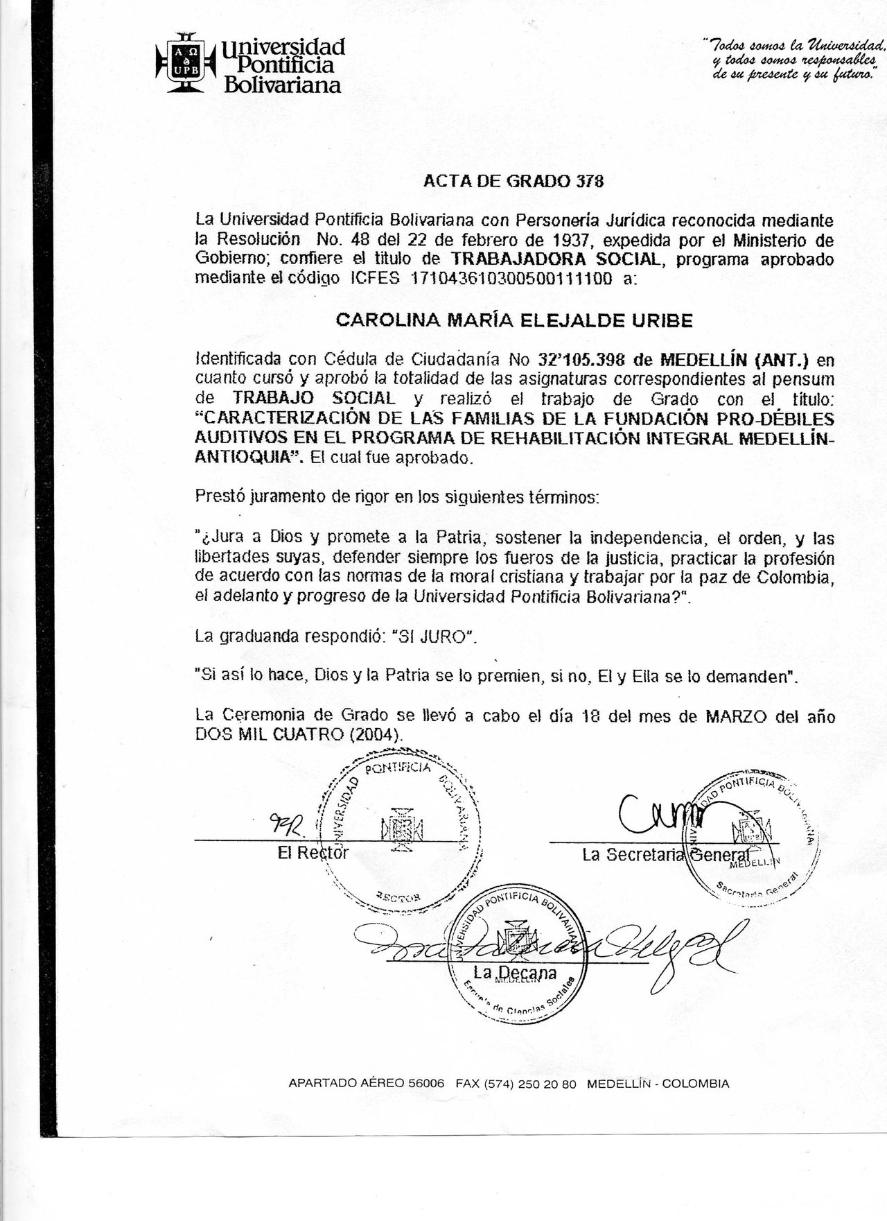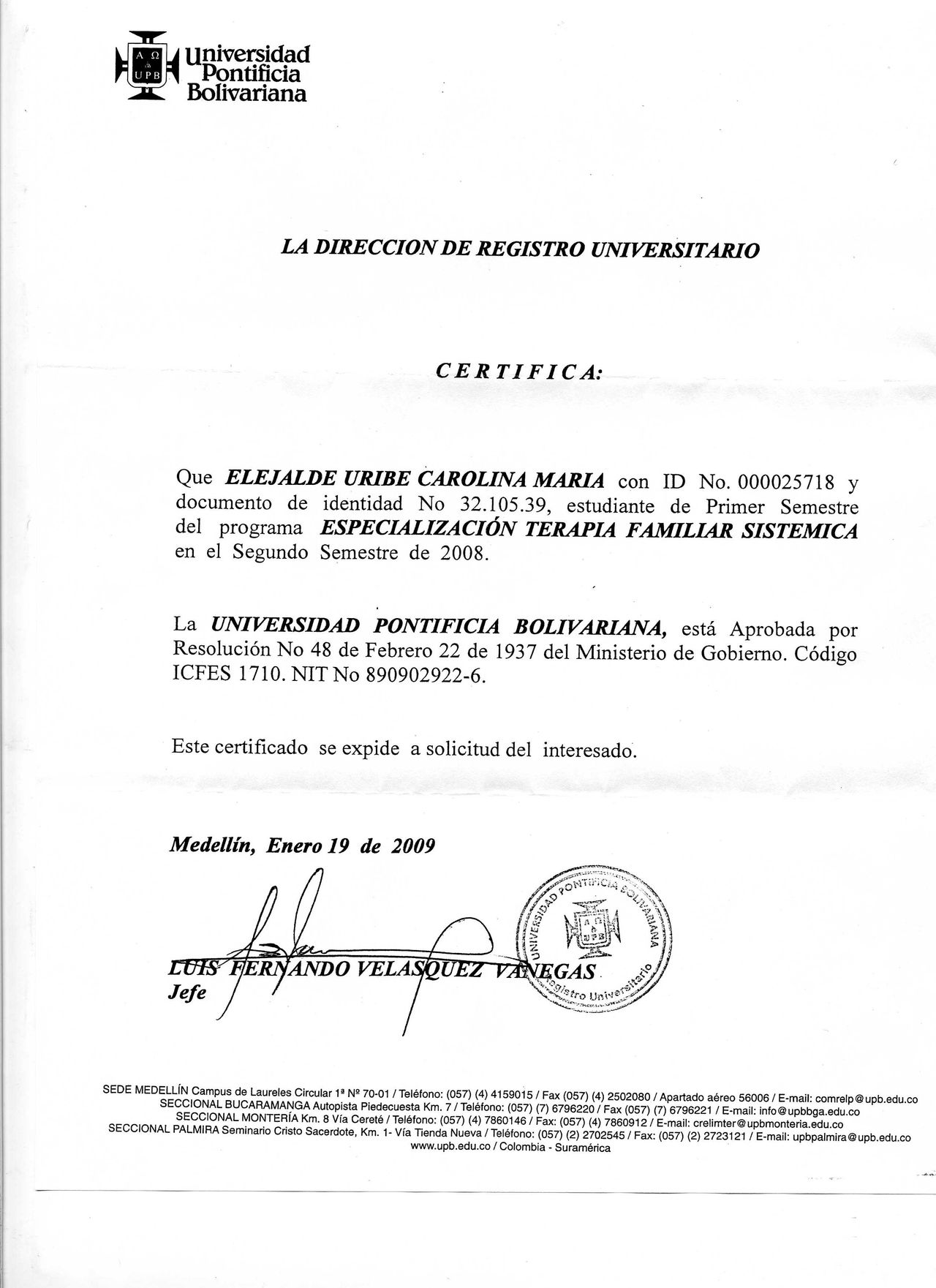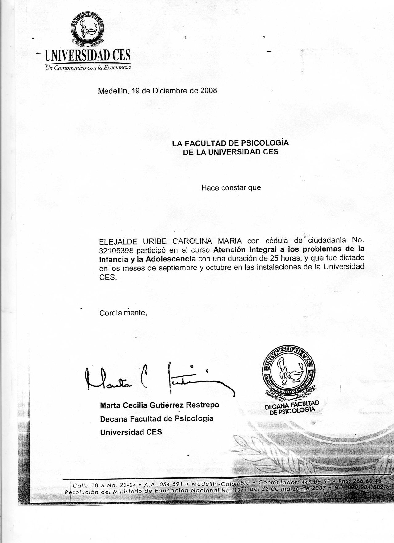 - Universidad Pontificia Bolivariana: Titulo de Trabajo, Especialista en Trabajo Social Familiar y Especialista en Terapia Familiar Sistémica